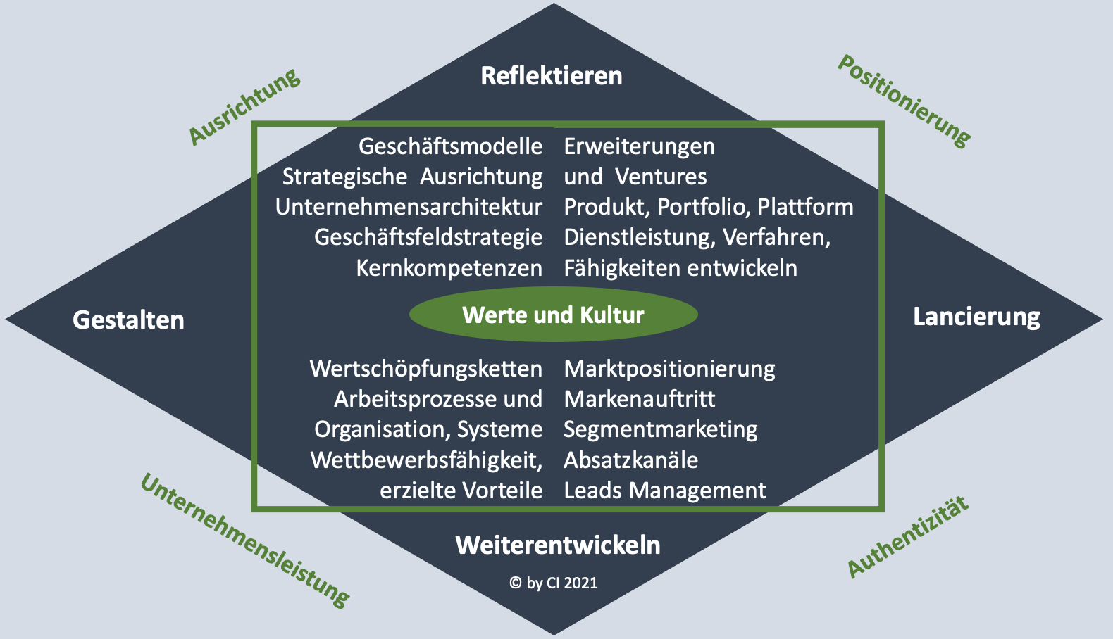 Differenzierte Innovationsportfolios und deren Marktpositionierung in Verbindung mit einer erneuerten Prozess- und Geschäftsmodell Architektur bringen das richtige Gleichgewicht von Effizienz und Kreativität. Die operative Effizienz soll als Basis zur finanziellen Wertsteigerung jederzeit sichergestellt sein. Eine auf Werten basierte Unternehmenskultur, schafft für Mitarbeitende die nötigen Leitlinien und Freiräume, kann Talente begeistern und so die Organisation zur Höchstform bringen.